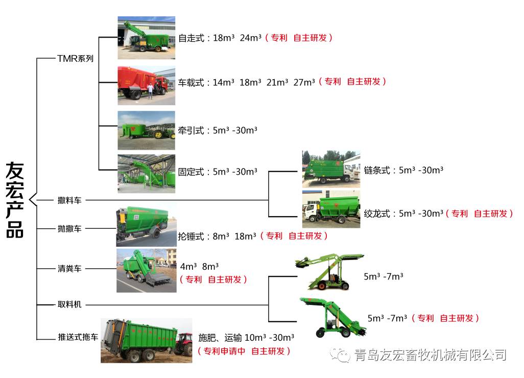 撒料車(chē)-清糞車(chē)-青島友宏畜牧機(jī)械有限公司 青島友宏畜牧機(jī)械有限公司成立于2002年7月,是一家集研發(fā)、 生產(chǎn)、銷(xiāo)售、服務(wù)于一體的高科技企業(yè)?,F(xiàn)有員工200余人,占地面積50000平方米,年產(chǎn)畜牧機(jī)械1000多臺(tái)。 公司自成立以來(lái),始終堅(jiān)持以人為本、誠(chéng)信立業(yè)的經(jīng)營(yíng)原則,公司人才結(jié)構(gòu)合理,擁有6位工程師組成的研發(fā)團(tuán)隊(duì),取得證書(shū)二十余項(xiàng)。 目前在全國(guó)設(shè)有8個(gè)辦事處,15個(gè)配件庫(kù),產(chǎn)品覆蓋全國(guó)30余個(gè)省份,并遠(yuǎn)銷(xiāo)中東、東南亞、東歐等地區(qū)。 同時(shí)配備了專(zhuān)業(yè)的售后服務(wù)團(tuán)隊(duì),可保證在時(shí)效內(nèi)提供售后服務(wù)和技術(shù)支持。 本公司的主營(yíng)業(yè)務(wù)為:1、TMR飼料攪拌機(jī)(自走式、車(chē)載式、固定式、牽引式、全系5-48m3)2、清糞車(chē)(5m3、8m3)3、青貯取料機(jī)